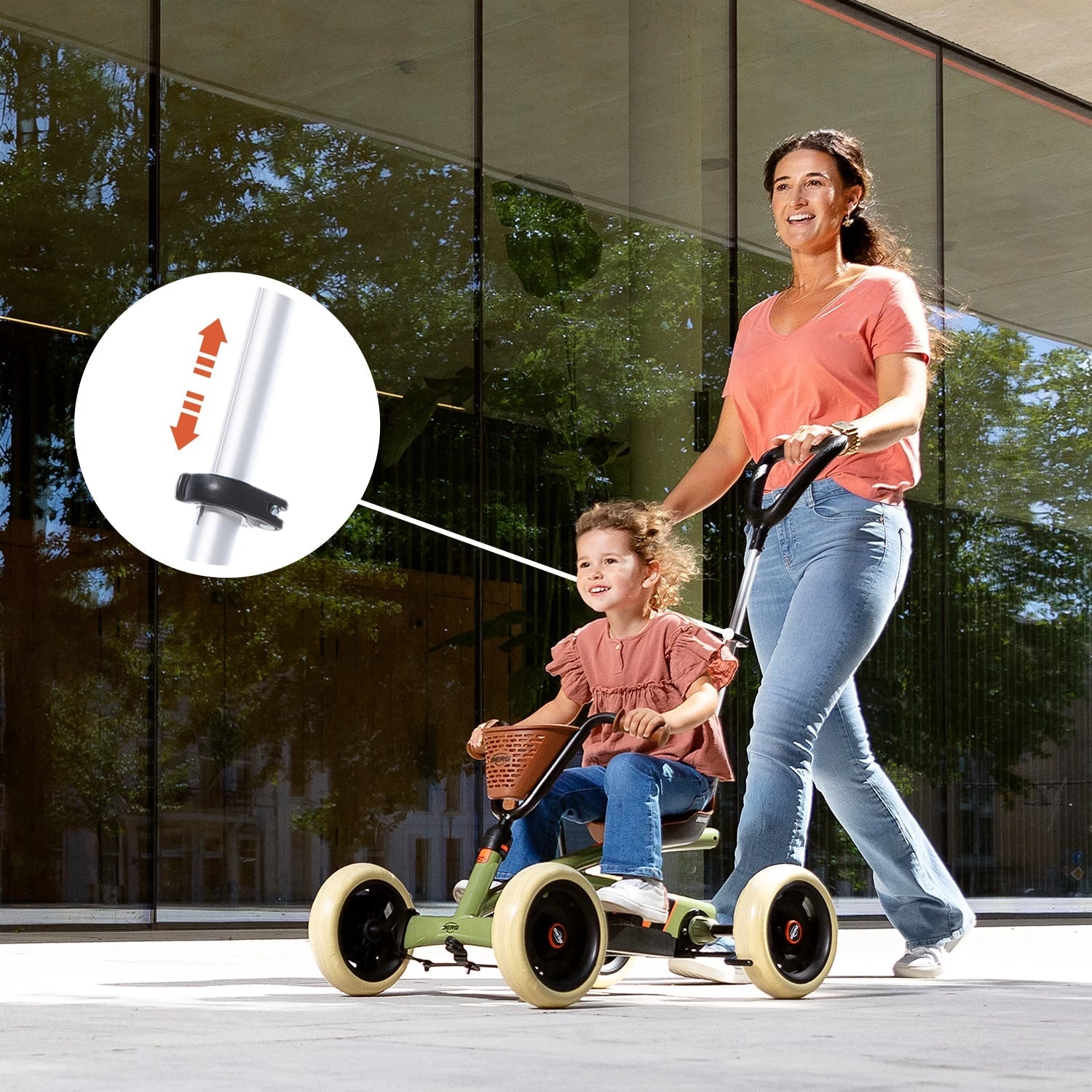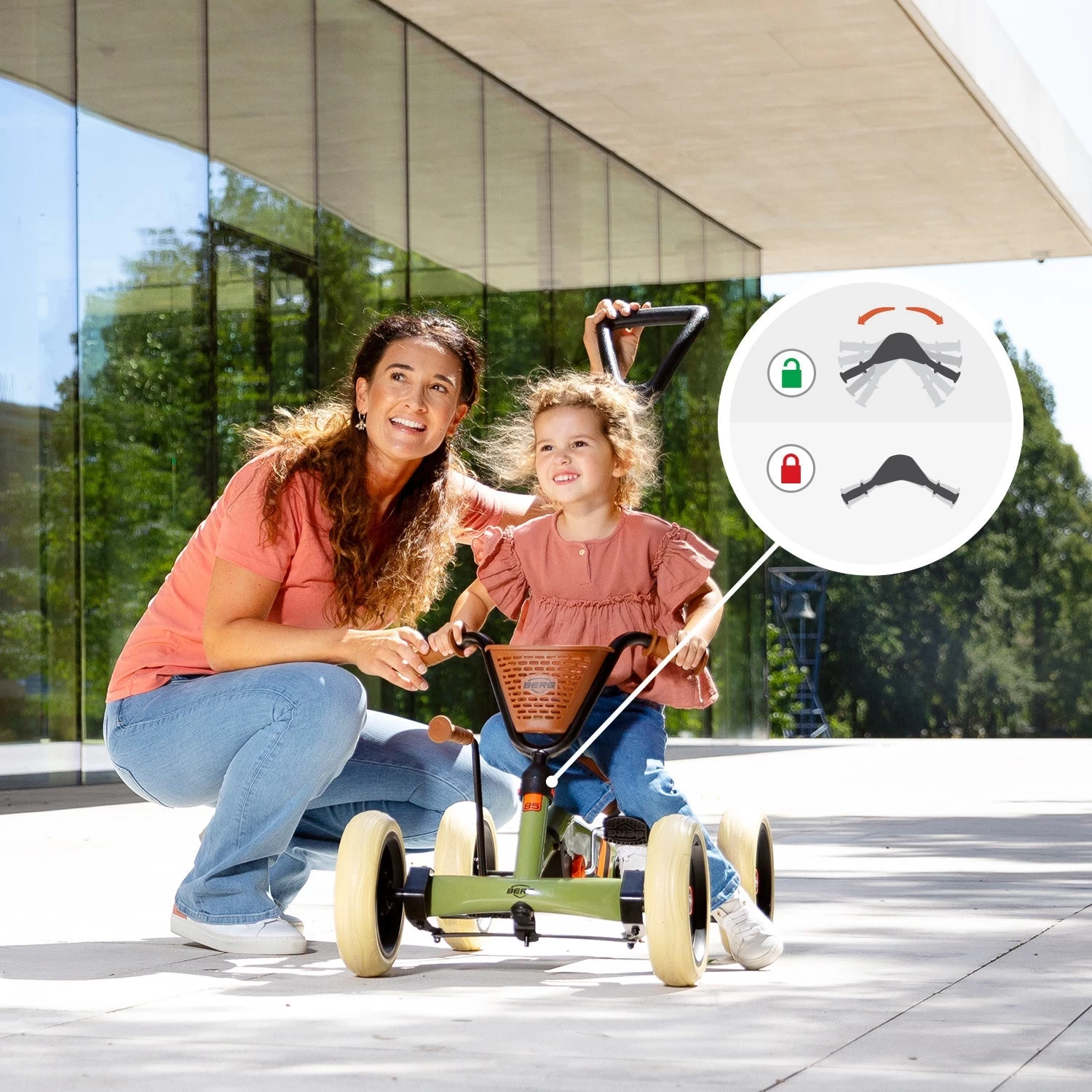 Check out the BERG Retro 2in1, it’s the ultimate in versatility. It’s classic style is sure to catch the eye of everyone around you. A stable pedal go-kart that can be used as a push cart and easily coverts when your little one is ready to ride on their own! The push bar helps you keep control of the go-kart and your child. Unlike tricycles, the pedals are not connected to the handlebars, so when your little one is steering, the pedals do not slip out from under their feet. Is your child tired and wanting to be pushed or perhaps full of energy and wanting to play? Either way, this Buzzy 2in1 can easily be converted from a push cart to an independent go-cart and vice versa.