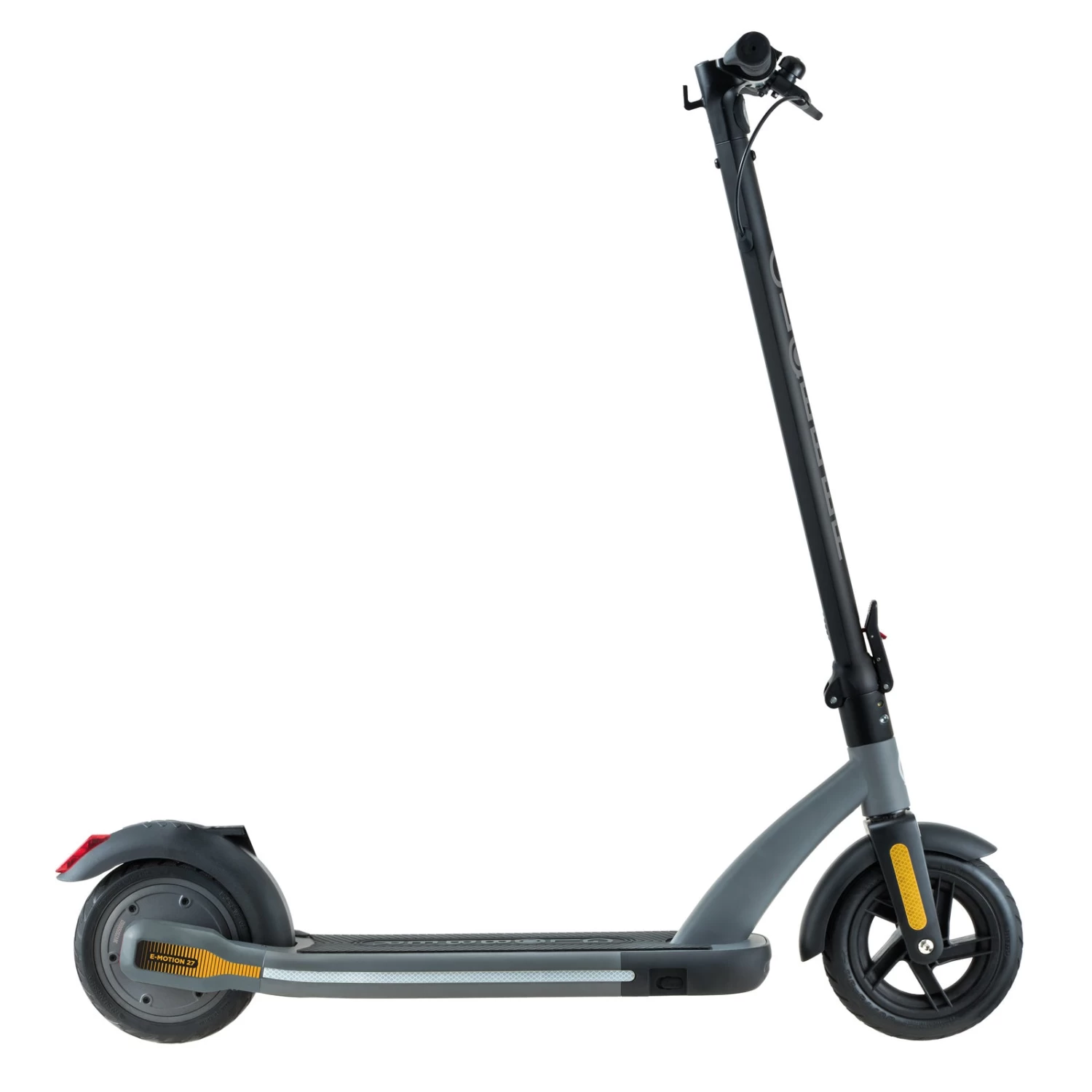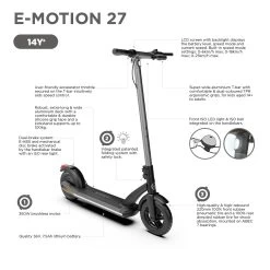 E-MOTION 27 is a foldable 2-wheel, light-up foldable electric scooter for teens (aged 14y+).ย ย With a powerful motor and quality battery, built-in front suspension, patented folding system, user-friendly throttle, anti-slip, light-up deck, dual-braking system, 2-height adjustable T-bar, and ISO bell and light, E-MOTION 27ย is a reliable and fun 2-wheel e-scooter designed with teens and adults in mind!