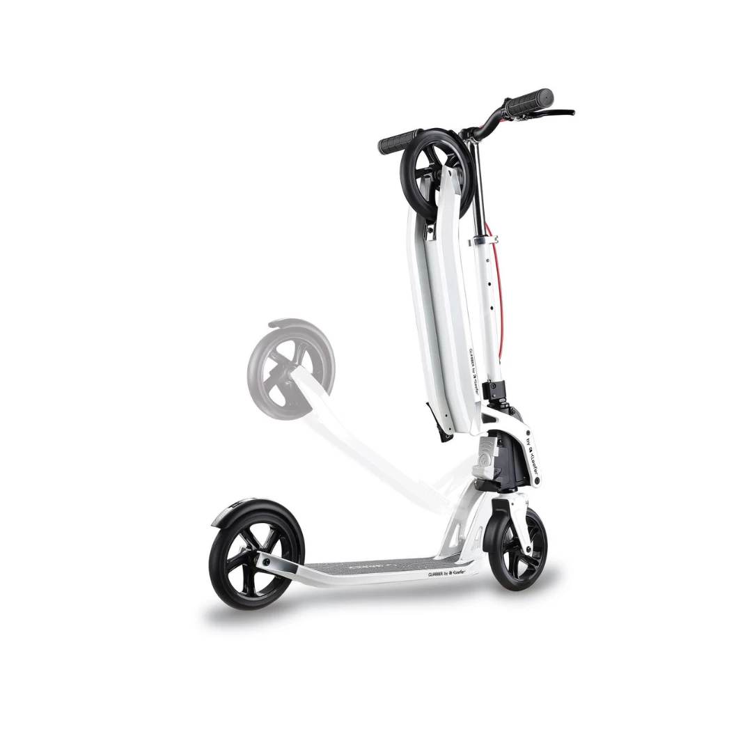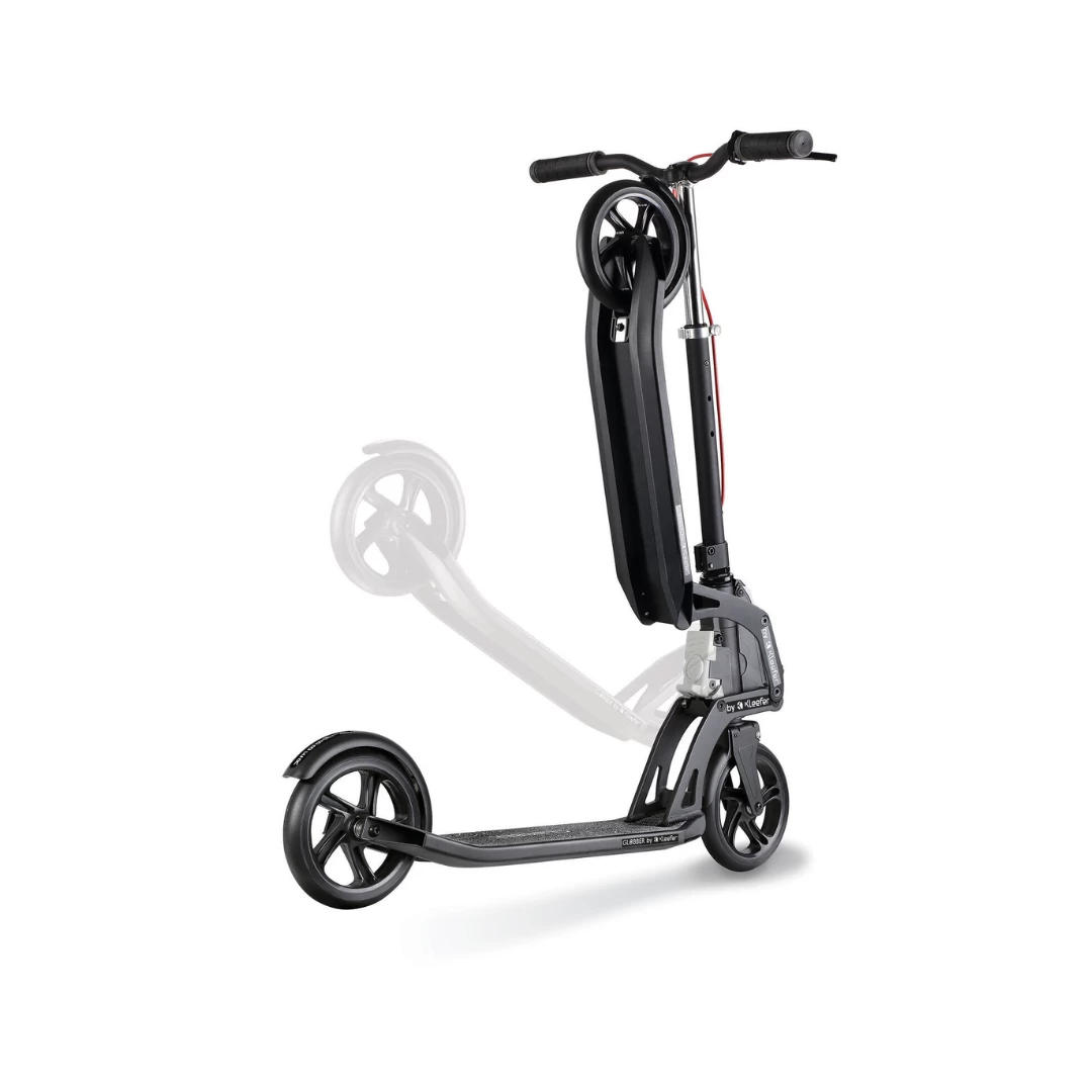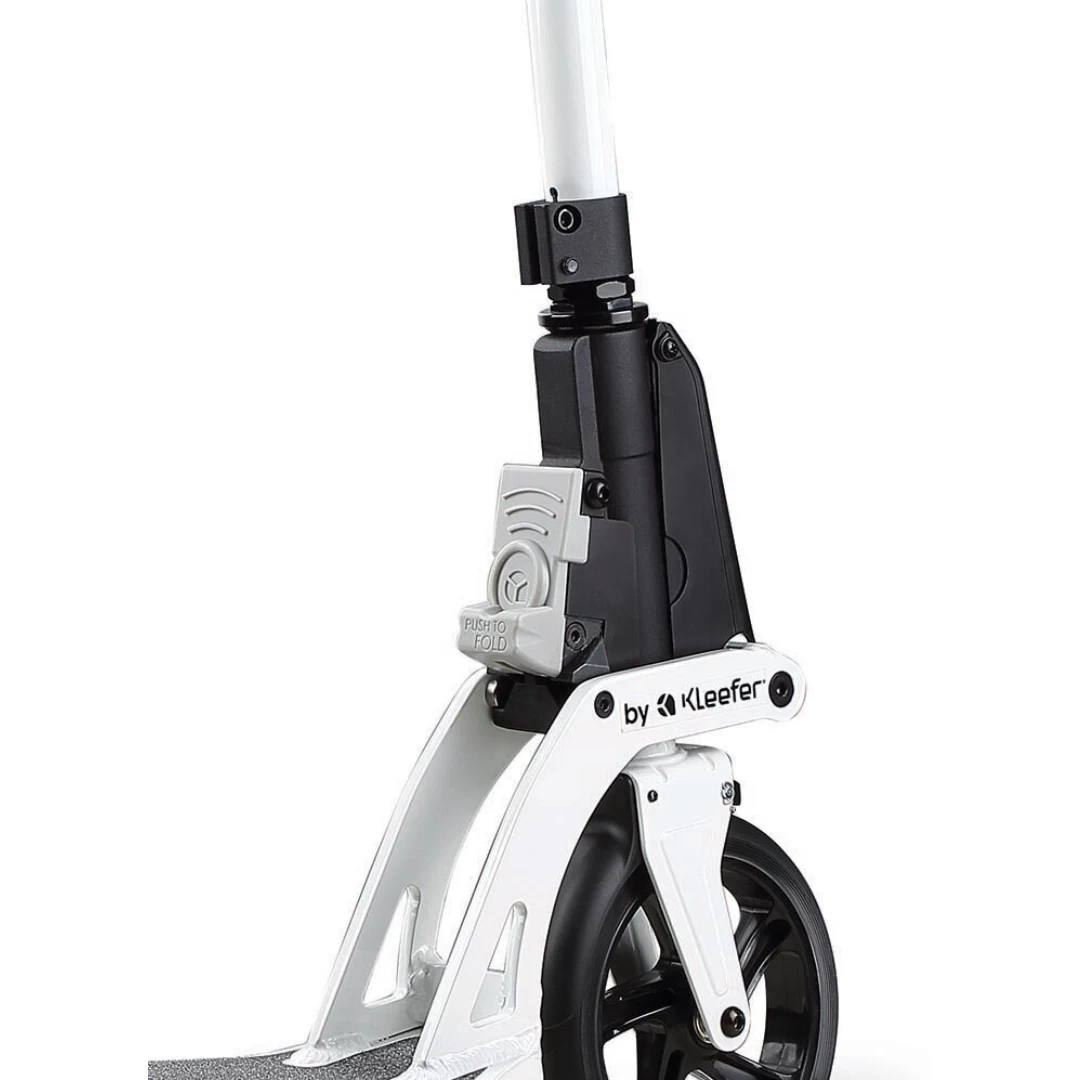 2-WHEEL FOLDABLE SCOOTER FOR ADULTS- Patented 1-sec piston-assisted kick & fold system by Kleefer. A quick and easy kick on the bottom of the column will fold the collapsible 2-wheel scooter for adults. Thanks to the piston-assisted mechanism, the rear wheel automatically lifts up, allowing you to effortlessly fold the scooter. Trolley mode for easy carrying.
