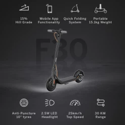 The F30 features front wheel E-ABS, rear wheel mechanical disc brake, double brake. It has 2.5W highlight LED headlights and 10-inch large wheel diameter pneumatic tires. The electric scooter offers practical performance and 15km-30km range with a 300W high-power motor and 15% climbing capacity.