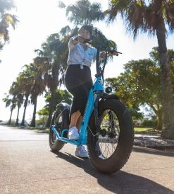 An electric Scooter that is cool to ride, big wheels and front suspension for maximum performance and compfort on and off road. 9 speed computer to set you up for the cruise you deserve, removable battery for added security and convienance of charging, lockable (just like a bike), and most of all fun to ride.